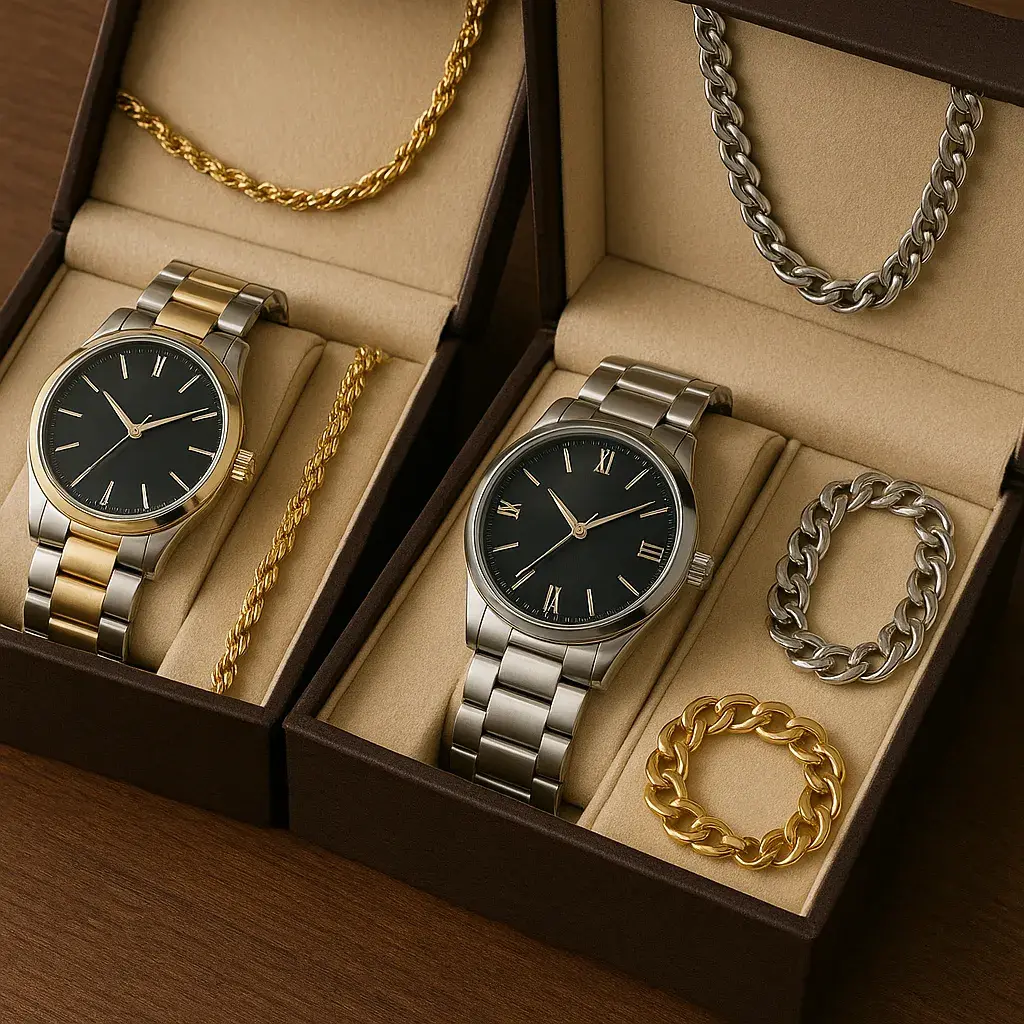 Ofereça ou leve para si um conjunto que combina praticidade com elegância. O kit une relógios sofisticados a acessórios de impacto, ideais para presentear com bom gosto ou renovar seu visual com atitude.