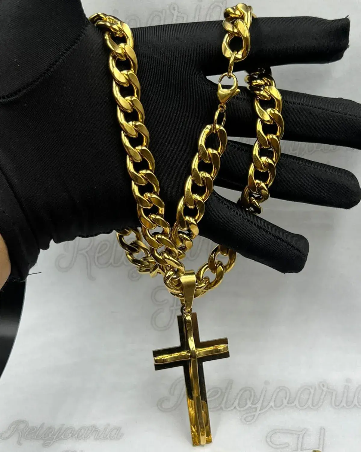 Além do relógio, o kit inclui um Cordão Masculino Banhado a Ouro 18k, um elegante Pingente e uma Pulseira, todos projetados com materiais de alta qualidade e acabamento impecável. Esses acessórios complementam o conjunto com sofisticação e harmonia, criando um visual moderno e imponente. Apresentado em uma embalagem premium, o kit é ideal para presentear ou para valorizar sua coleção de acessórios de luxo.