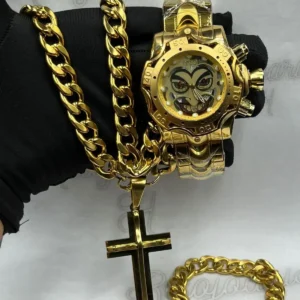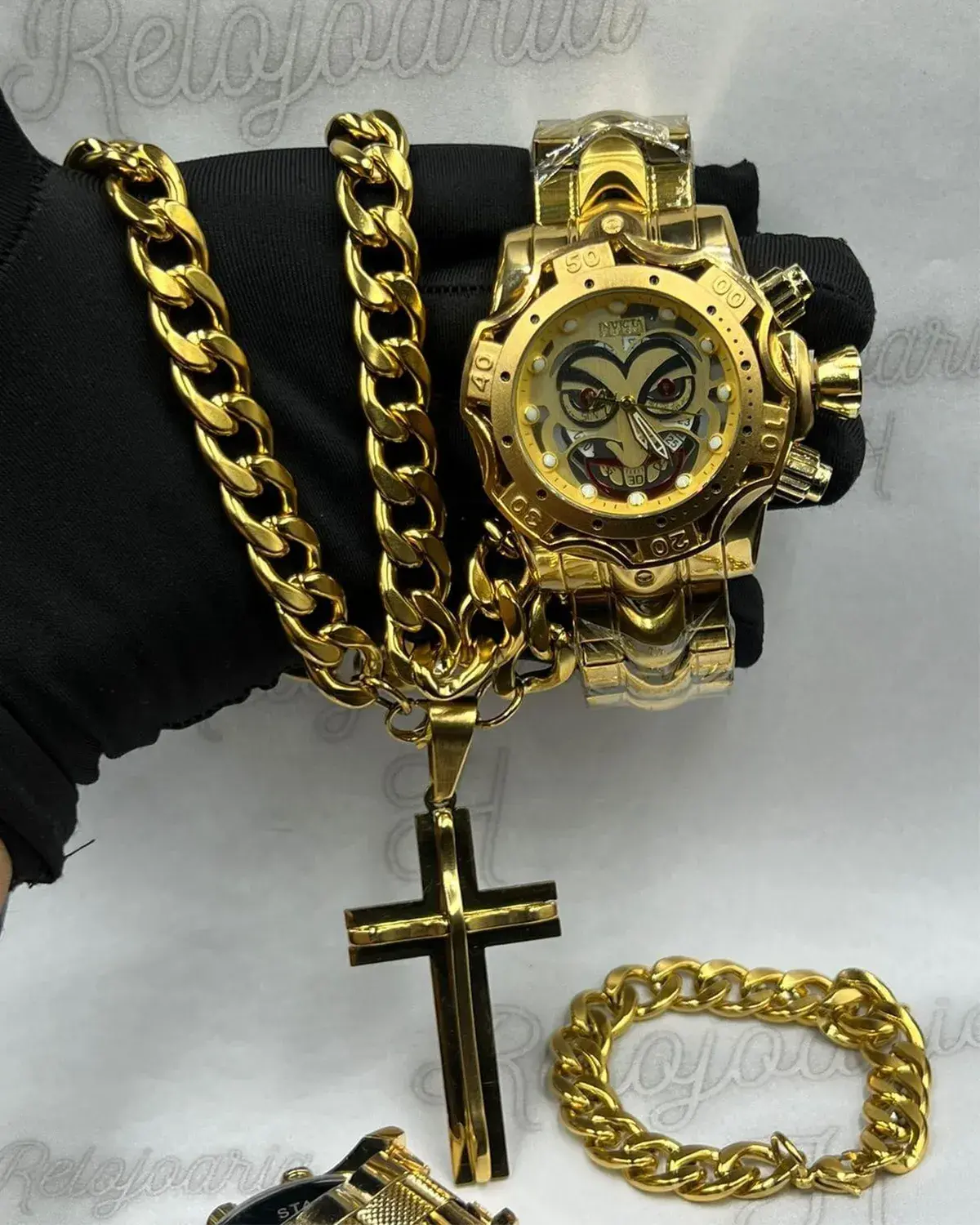 O Kit Linha Ouro Banhado 18k inclui o relógio masculino Invicta Joker (dourado e preto ou totalmente dourado), resistente à água, cordão, pingente e pulseira banhados a ouro – um conjunto exclusivo que une estilo e funcionalidade.