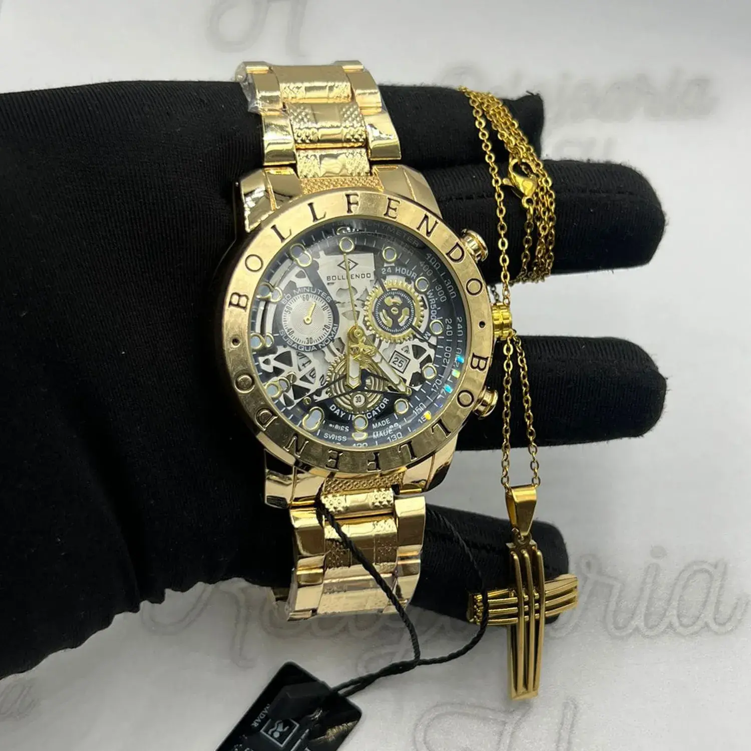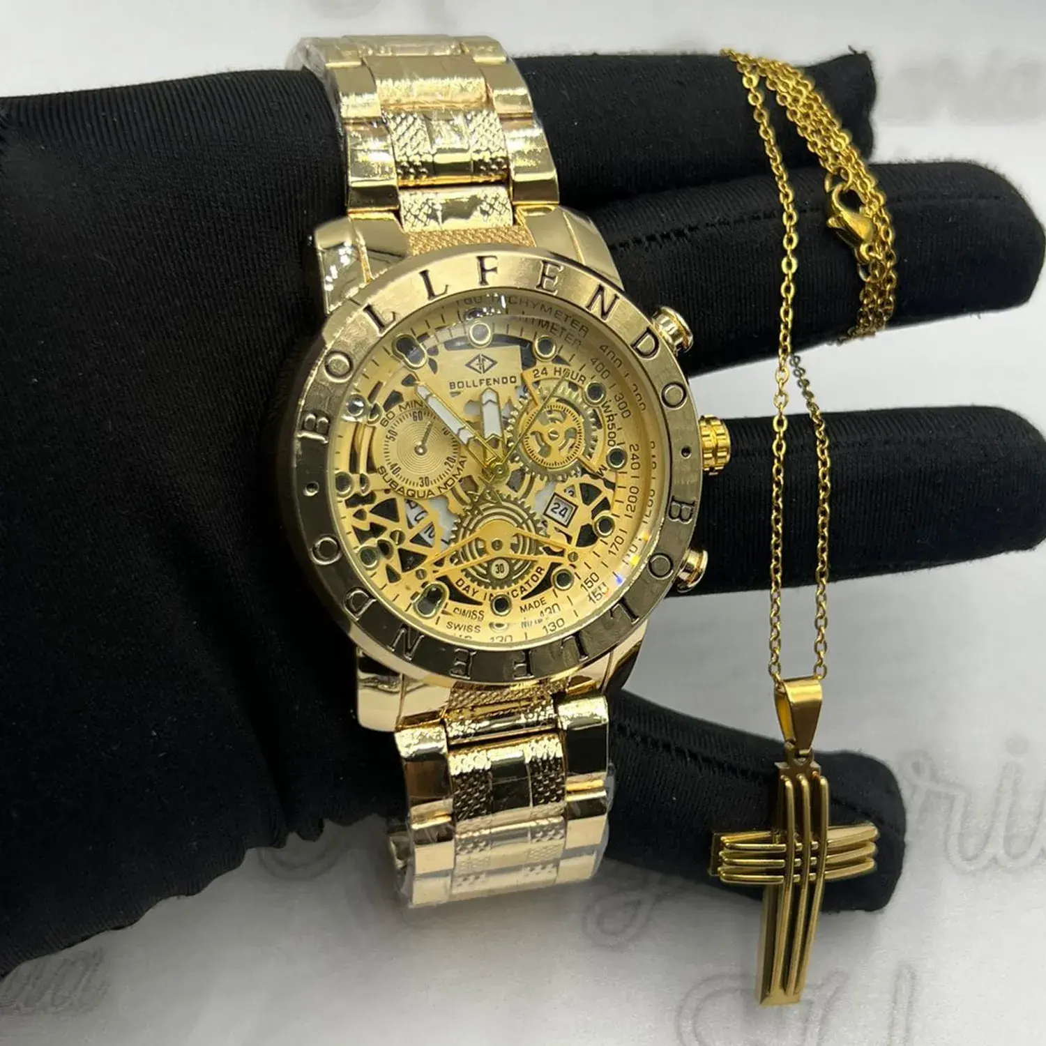 O Relógio Masculino Bollfendo Skeleton combina design skeleton sofisticado com resistência à água. Disponível nas cores dourado e dourado com fundo preto, inclui um cordão elegante, formando um conjunto único e estiloso.