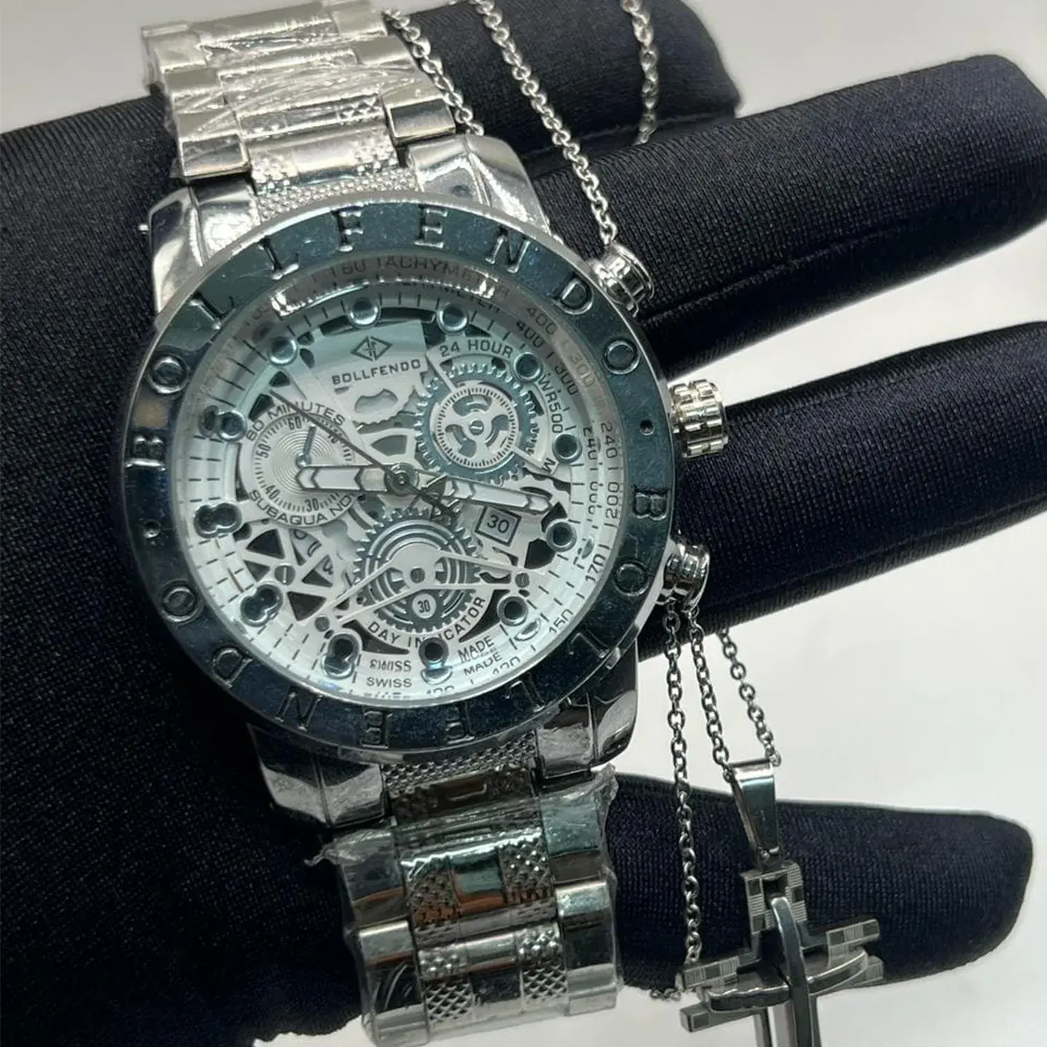 Relógio masculino Bollfendo Skeleton na cor prata, à prova d’água, acompanhado de um cordão com pingente de cruz. Elegância e versatilidade reunidas em um conjunto sofisticado